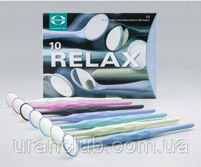 Relax – дзеркала фронтові з родієвим покриттям. Цілісні пластикові полегшені автоклавуємий дзеркала. Зручні для щоденного застосування. Мають дуже високу ступінь кольору. Випускаються в таких розмірах: №4 і №5. Кольори: білий, пастельно-жовтий, пастельно-блакитний, пастельно-бірюзовий, пастельно-фіолетовий, антрацит.